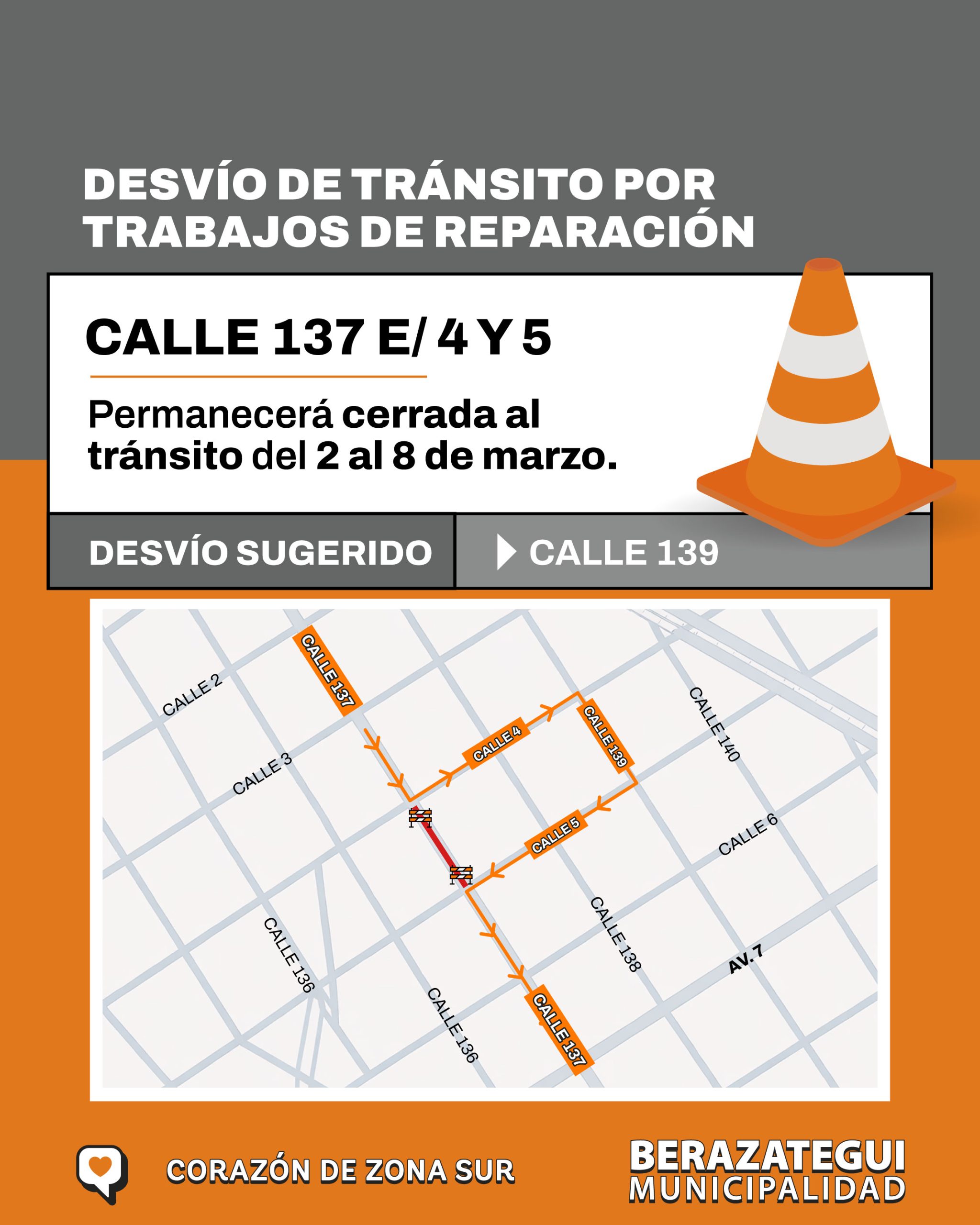 La Municipalidad de Berazategui informa que debido a la realización de obras de bacheo, del lunes 2 al domingo 8 de marzo inclusive, la calle 137 e/ 4 y 5 permanecerá cerrada al tránsito. Se solicita a las y los conductores tomar caminos alternativos.