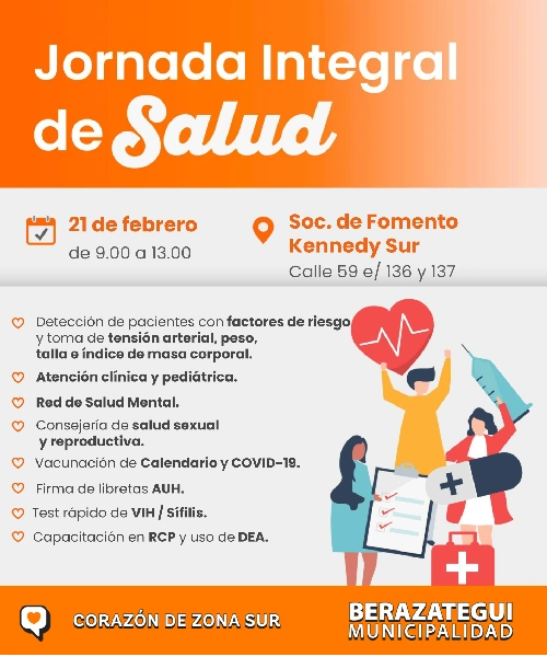 Se realizará una nueva Jornada de Salud Integral en Berazategui, en esta oportunidad en la Sociedad de Fomento Kennedy Sur (calle 59 e/ 136 y 137). Será este viernes 21 de febrero, de 9.00 a 13.00. Allí, los vecinos y vecinas podrán acceder a atención gratuita en distintos servicios de salud.
