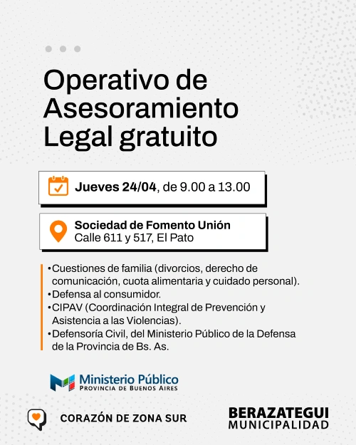 La Municipalidad de Berazategui, junto con el Ministerio Público de la Defensa de la Provincia de Buenos Aires, acercará atención y asesoramiento legal gratuito a los barrios, mediante operativos ambulantes. La primera jornada se realizará en la Sociedad de Fomento Unión (calle 611 y 517, El Pato), el jueves 24 de abril, de 9.00 a 13.00.
